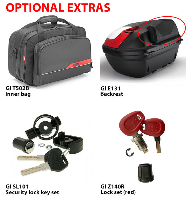 Born from years of experience, Givi has perfected one of their best-loved products, creating the new E455. This economic yet good sized top case gives you all the space that you need for your travels, allowing you to comfortably fit up to two full-face helmets. Givi's Monolock fixing system guarantees fast, simple attaching and removal of the E455 and is compatible with most motorcycles and scooters on the market. The gasket used offers excellent water resistance, so you can keep your luggage dry under even the heaviest rain: tested with a special machine that simulates rain with a flow rate of 20 ltr/min.