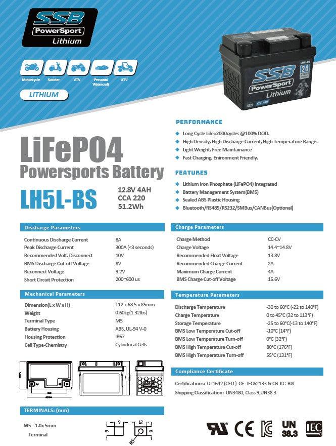 The SSB Powersport Lithium UltraLite LiFePO₄ range delivers unmatched power, durability, and ultra-lightweight performance perfect for modern motorcycle starting applications. These high-tech batteries are completely dry, spill-proof, and leak-proof, making them maintenance-free and ideal for all riding conditions.