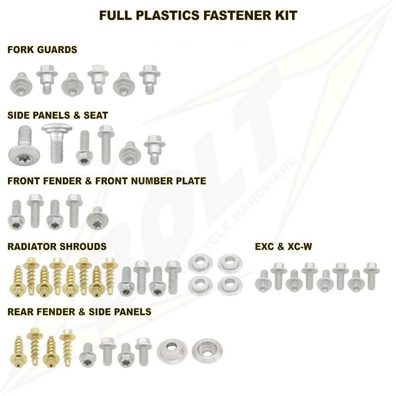 Keep your plastics tight, your bike dialed, and your ride looking race-ready with the BOLT Body Work Fastener Kit purpose-built for modern KTM two-strokes. This all-in-one kit is designed to replace every essential fastener needed when mounting or refreshing your fork guards, fenders, number plates, radiator shrouds, and seat.