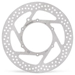 The Moto-Master HALO Series sets a new standard in aftermarket circular-round design brake rotors. Its premium quality stainless steel outer ring allows for high performance braking while at the same time extremely durable. Exact size and positioning of the venting holes ensures equal heat dispersion under high thermal stress while the brake pad contact surface is cleaned evenly. The laser cut and precision grinded outer ring is fixed to a billet CNC machined aircraft aluminum carrier which is black anodized and laser marked. Newly designed lightweight stainless steel floaters complete the package.