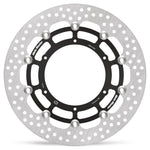 The Moto-Master HALO Series sets a new standard in aftermarket circular-round design brake rotors. Its premium quality stainless steel outer ring allows for high performance braking while at the same time extremely durable. Exact size and positioning of the venting holes ensures equal heat dispersion under high thermal stress while the brake pad contact surface is cleaned evenly. The laser cut and precision grinded outer ring is fixed to a billet CNC machined aircraft aluminum carrier which is black anodized and laser marked. Newly designed lightweight stainless steel floaters complete the package.