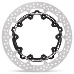 The Moto-Master HALO Series sets a new standard in aftermarket circular-round design brake rotors. Its premium quality stainless steel outer ring allows for high performance braking while at the same time extremely durable. Exact size and positioning of the venting holes ensures equal heat dispersion under high thermal stress while the brake pad contact surface is cleaned evenly. The laser cut and precision grinded outer ring is fixed to a billet CNC machined aircraft aluminum carrier which is black anodized and laser marked. Newly designed lightweight stainless steel floaters complete the package.