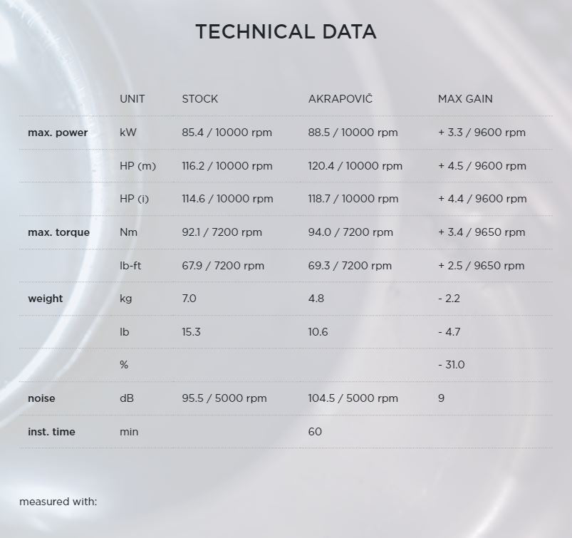 This exhaust has a lightweight carbon-fibre muffler outer sleeve and heatshield, combined with stainless steel link pipes and headers and finished with a titanium end cap, to produce a system that is 2.2 kg (31%) lighter than stock.