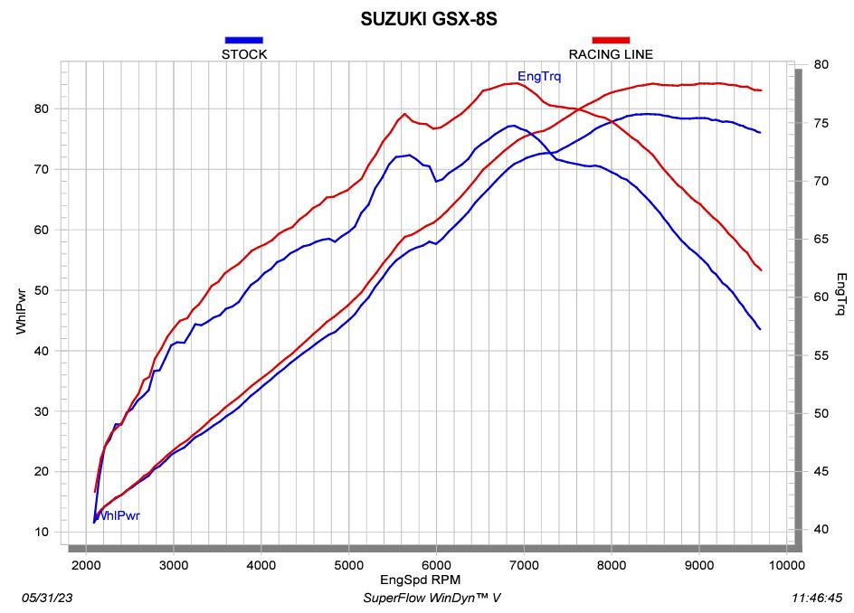 This is a completely new exhaust designed from scratch and constructed using lightweight race-proven materials. A carbon-fibre muffler outer sleeve, heatshield, and clamp, a titanium end cap, stainless-steel header, resonator, and link pipe, and a black-coated aluminium muffler bracket create a weight saving of 39.6% (3.2 kg) over the stock exhaust. Alternate routing of the exhaust places it on the right side of the machine (the standard version goes under the bike), resulting in a more racing style, and the carbon-fibre heatshield provides protection from heat and an attractive final touch. It offers power and torque increases of 4.7 kW (6.4 hp) at 9,200 rpm and 4.7 Nm at 7,650 rpm, respectively, when tested on the Akrapovič dyno and compared to a Suzuki GSX-8S equipped with the standard stock system.