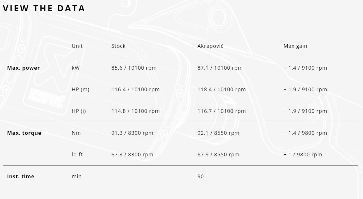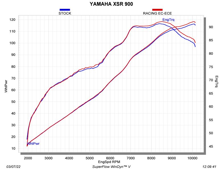 The muffler exits on right side of the bike (standard is underneath), emphasizing the racing and retro look of the machine. The system delivers a deep, full, and vivid sound allied to a perfect throttle response, and it adds 1.4 kW (1.9 hp) of power at 9,100 rpm and increases torque by 1.4 Nm at 9,800 rpm when measured on the Akrapovič dyno against a Yamaha XSR900 with a standard stock exhaust system. It has plug-and-play installation, with no remapping needed.