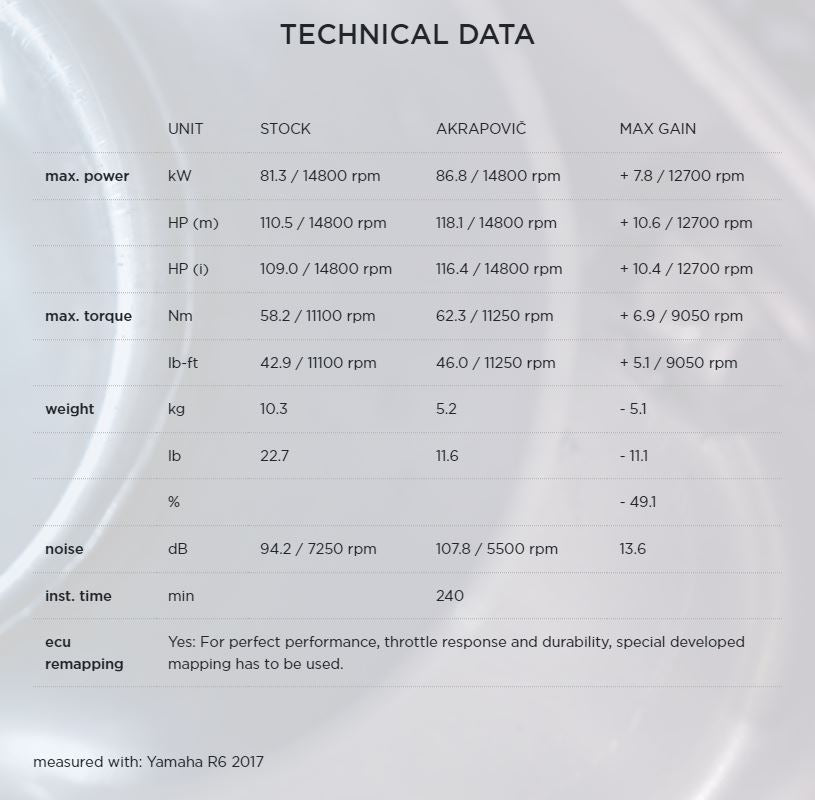 The Akrapovič Racing system is designed for riders who demand maximum performance. Racing system is lighter if compared to stock exhaust system and features exceptional production quality, hi-tech materials and of course increased engine performance combined with pure racing sound output. Featuring a completely new-shape muffler design—inspired by Akrapovič’s involvement with top-class race teams, the Racing Line exhaust will give the bike that “Grand Prix” look and also totally transform the bike by adding more power, improving performance, and giving it that unique sporty Akrapovič sound.
