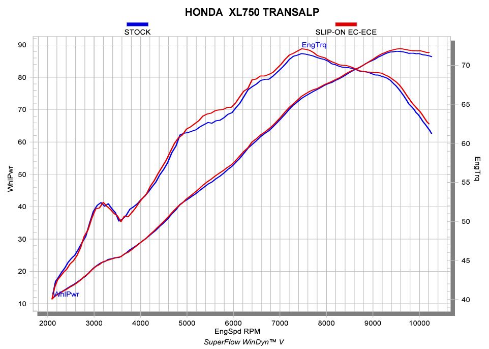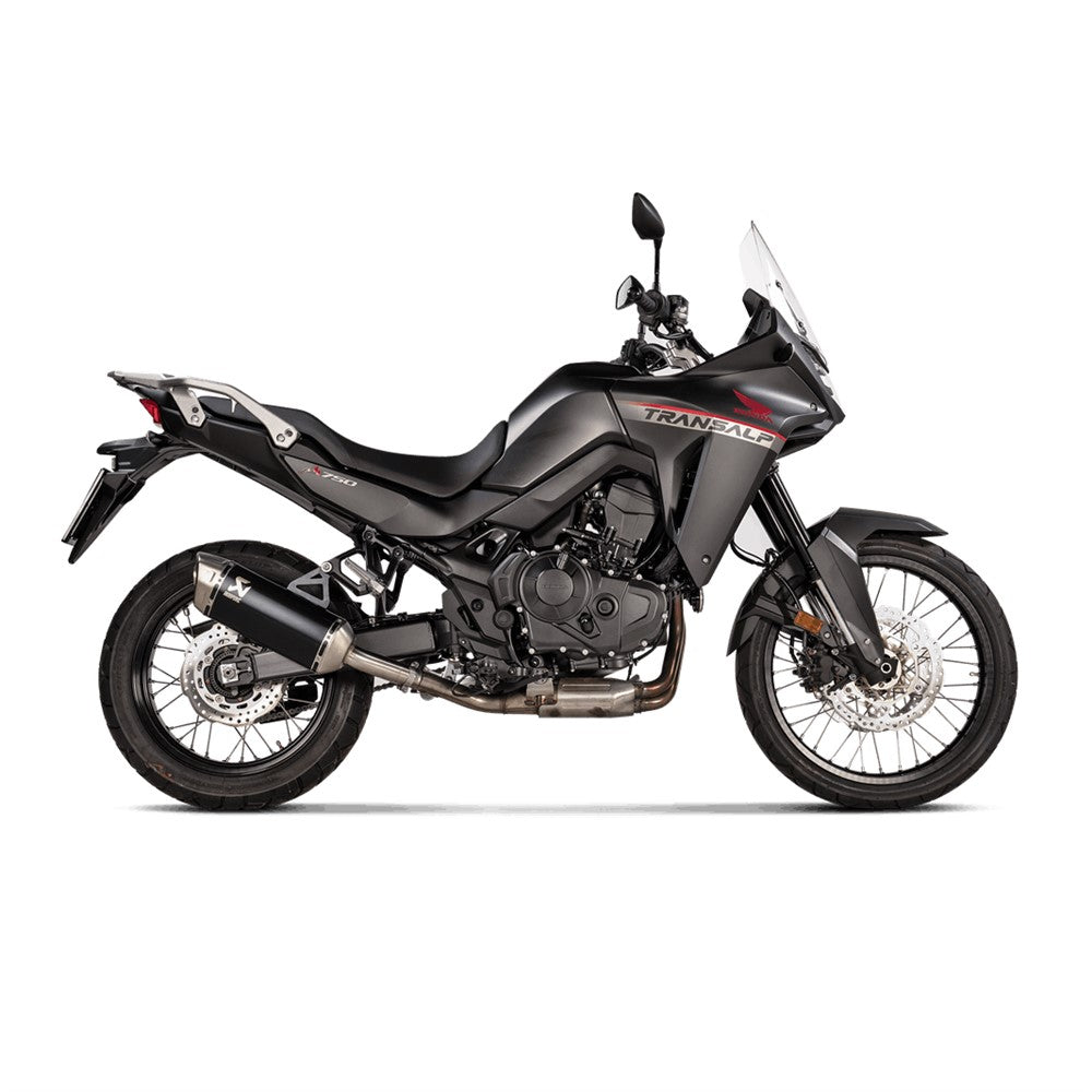 This product is built with a high-grade black titanium muffler outer sleeve and a quality stainless-steel inner structure and link pipe, all leading to a high-grade titanium end cap with a new design featuring imprints for a sporty look. Weight is reduced by 39.8% (1.6 kg) in comparison to the standard exhaust. There are power and torque gains, especially in the mid- to high-range revs, with increases of 0.7 kW (0.9 hp) at 5,700 rpm and 1.3 Nm at 5,700 rpm, respectively, when compared to a Honda XL750 Transalp equipped with a standard stock system and tested on the Akrapovič in-house dyno. This is a fully EC/ECE type-approved Euro 5 system, with no remapping needed – just a plug-and-play installation. It serves up a deep, sporty, and vivid Akrapovič sound and is fully compatible with Honda original side panniers.