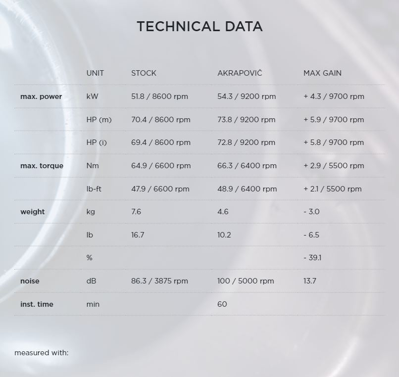 This complete exhaust system is constructed with a high-grade, lightweight titanium outer sleeve and end-cap for muffler, with a stainless-steel link pipe and headers. It weighs in at 3.0 kg lighter than the standard stock exhaust. A noise insert is included in the package because the open version of the system has no catalytic converter and was developed for use on racetracks or closed courses only. Designed to integrate with the lines of the bike, the resonator is located under the body, hidden by the lower fairings, and the muffler exits on the right side of the bike. It is finished with an eye-catching heatshield, inspired by those on the Yamaha R6 and R1. Impressive performance increases of 4.3 kW (5.9 hp) at 9,700 rpm and an added +2.9 Nm at 5,500 rpm have been achieved when tested on the Akrapovič dyno against a standard stock exhaust. The racing sound matches the bike’s sporting credentials.