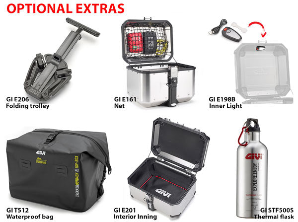 Givi's Trekker Alaska range now has a matching top case. This roomy top box has a large 56 litre capacity and will comfortably hold 2 helmets. Alaska cases attach using Givi's patented and time proven Monokey system, which allows the use of a single key for opening the lid, as well as for releasing the case from its mounting plate. Particular care has been given to ensuring the product is durable and repairable: the removal system, the stabilisers at the bottom, the base and other components can be easily replaced, greatly extending the useful life of your top case. Available in two finishes, natural silver or matt black painted aluminium.