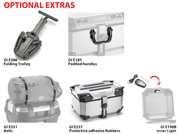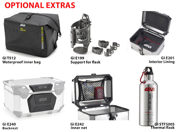Trekker Outback is the top of the range aluminium touring case from Givi, designed specifically for off-road use. The OBK top boxes can be attached to any existing Monokey plate. The new OBKE58A top case has innovative top and bottom corners featuring eyelets, which eliminate and incorporate the strap loops to make the attachment to the tubular handles more secure. Capable of resisting the bumps and stresses inevitable on off-road journeys, the case comfortably holds 2 modular helmets so you can be ready for any adventure. The new friction rotation system for the lid, Adjustable Resistance Hing System (ARHS), makes it possible to adjust the closing speed as desired, avoiding any inconvenience while parked on slopes.