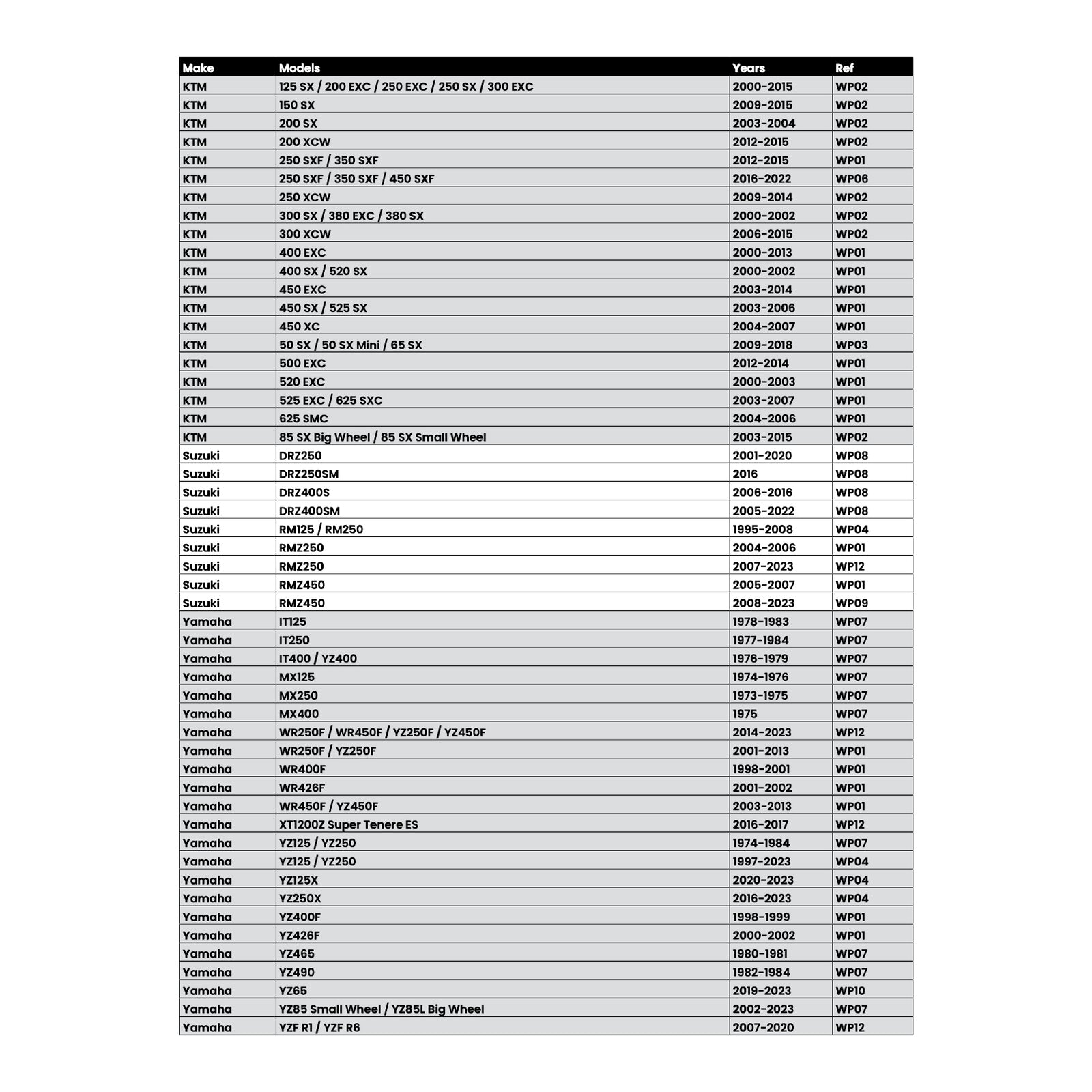 Note: Some KTM/Husqvarna/Gasgas models may require using the OEM cam or the additional purchase of White’s cam set WPGRPLGC13.