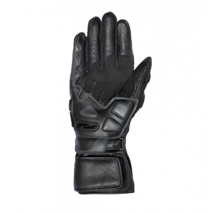 ~ Protections and shell: leather-covered knuckle shell, racing slider, reinforced palm, reinforced edging, anti-bend-back protection between the third and little fingers