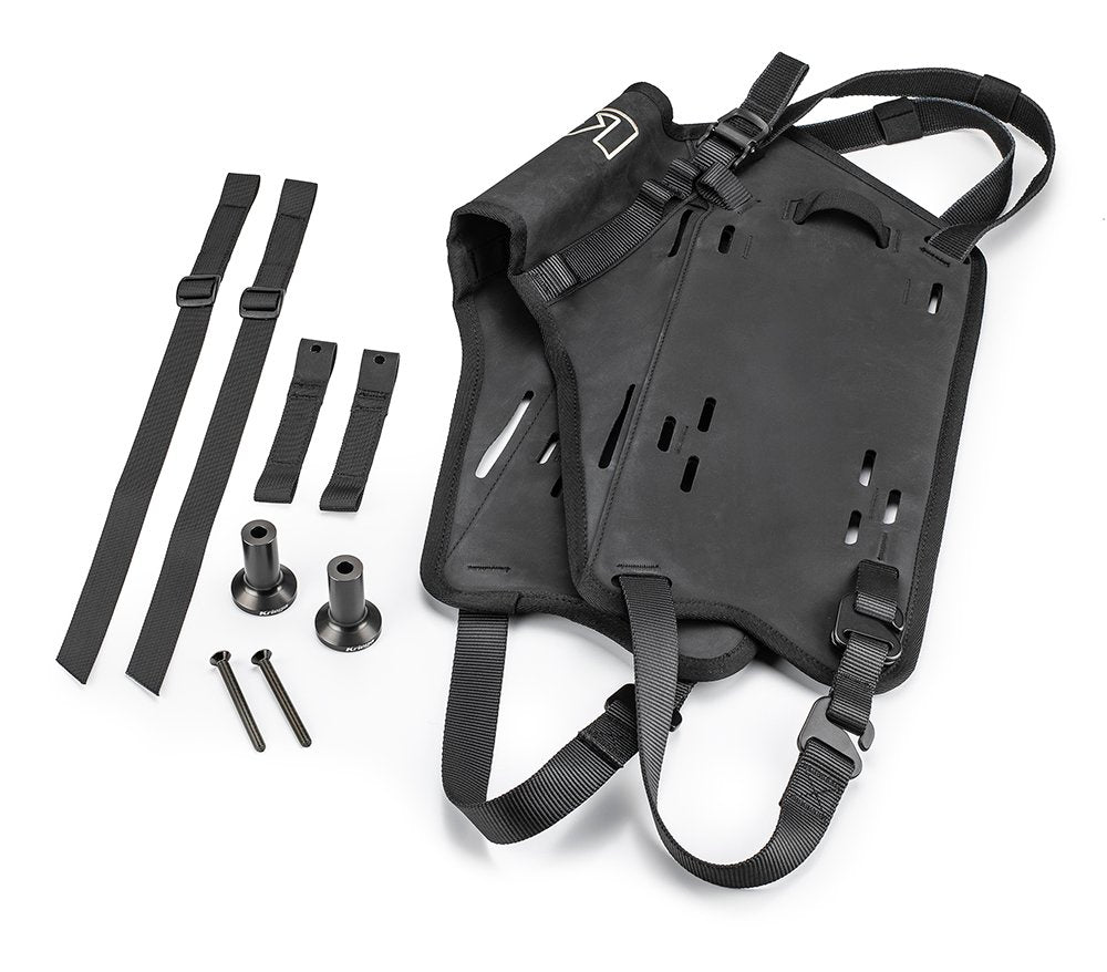 This system provides a super-tough, lightweight carrying solution, with no bodywork alterations needed. The fitting hardware gives the flexibility to mount a one, two, or three-pack set-up, depending on your type of ride. The set-length straps make mounting quick and easy, and the custom shape provides a tight, secure fit with plenty of distance from the exhaust. It takes less than a minute to mount and just seconds to remove it.