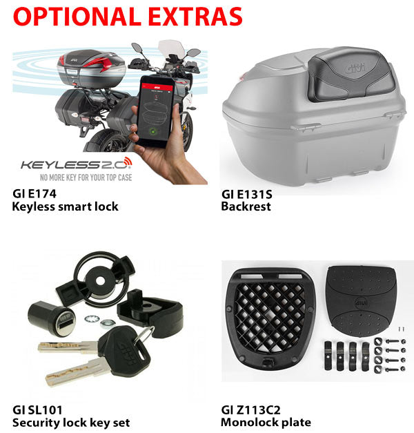 This 36 litre Monolock top box comes in black with red reflectors. A great size to easily fit one full face or two scooter helmets plus more. Comes with mounting plate included. Maximum loading of 3kg.