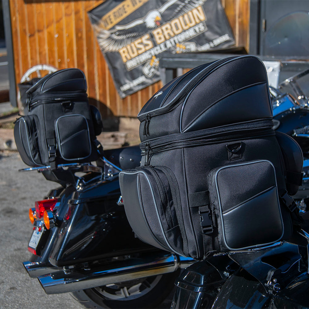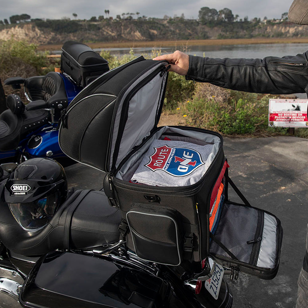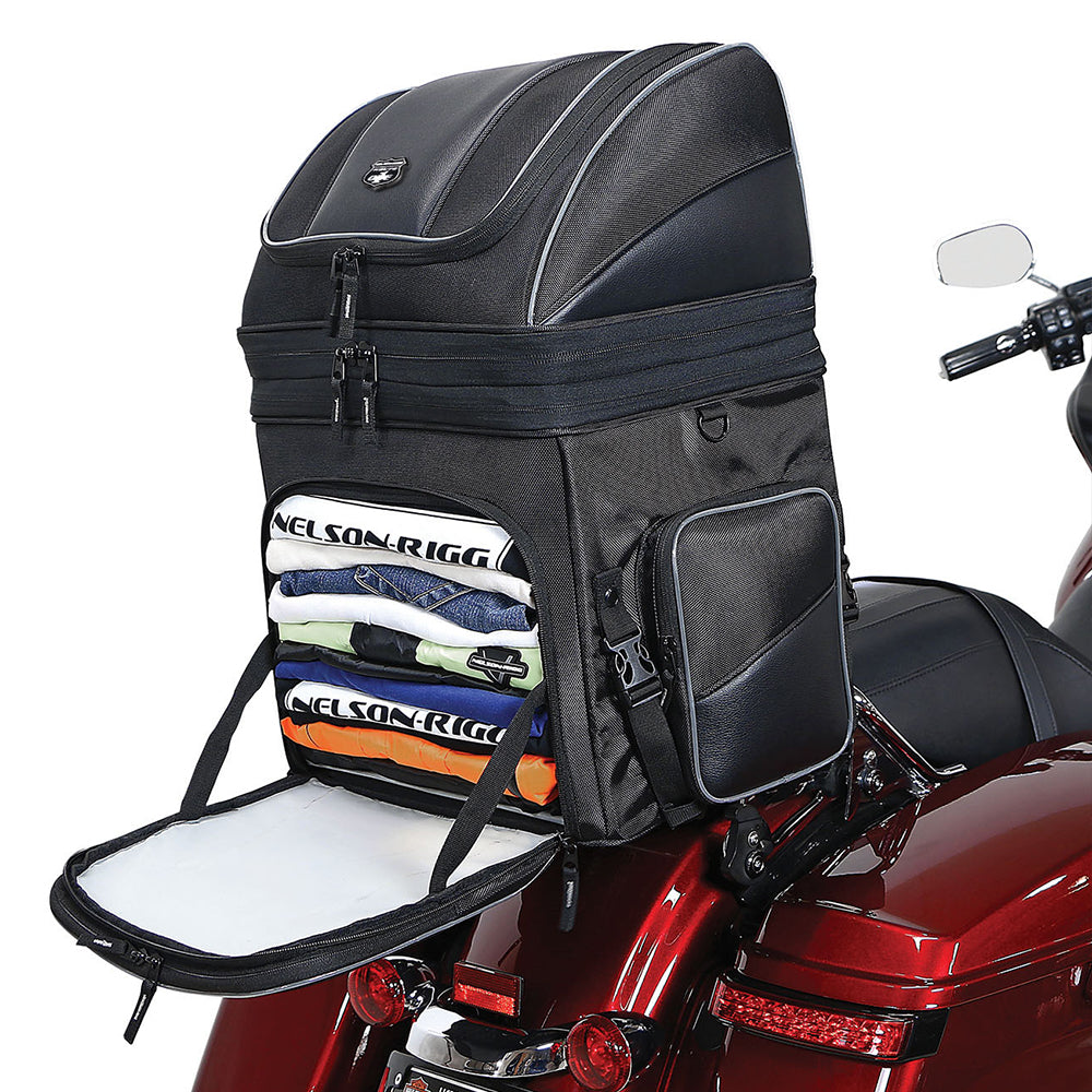 The Nelson Rigg Destination Tail / Rack Bag is made with industry-leading UltraMax® fabric and comes with a lifetime warranty. It offers maximum UV protection against fading and features a strap mount system for secure attachment. The bag includes a 100% waterproof rain cover and has lockable zippers for added security. It mounts to a rack, sissy bar, or seat using quick-release and self-fastening straps. The rigid construction and solid base panel prevent sagging. A zippered panel in the top section converts the bag to one massive compartment, while the front pocket folds down to provide easy access to the main compartment. An additional 7.5cm expansion section and three generous outer pockets offer ample storage. The carry handle makes it easy to transport the bag off the bike, and reflective piping enhances visibility. Additionally, the bag can mount directly to a seat with the optional NR-USA (Under Seat Attachment).