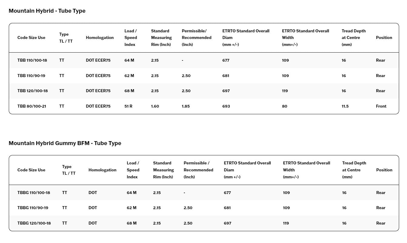 ~ Dimensions of an off road tyre to maintain the bike’s handling characteristics
