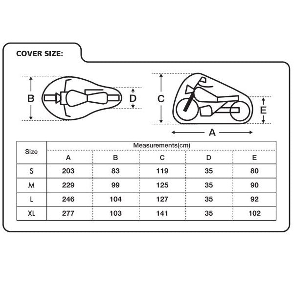 Designed for both outdoor and indoor use, it offers protection against rain and dust. Police initiatives have also shown that bike covers can be a useful theft deterrent. This is especially true if you securely the belly strap in place and use the cover in conjunction with a chain lock, threaded through the lock holes provided, securing both motorcycle and cover in place at the same time.