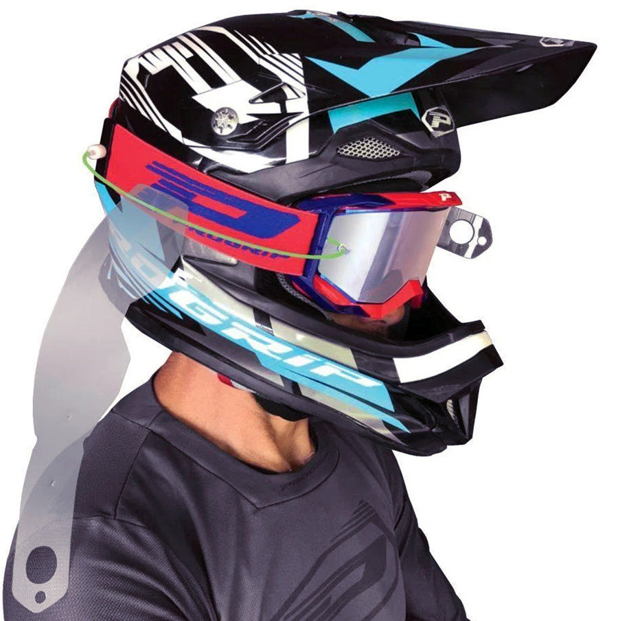 The new green system by PROGRIP allows the use of tear offs without the environmental impact of dropping them on the ground. Cleverly designed but a simple concept means that the tear off is loaded on the normal way but when pulled is retained on a wire to be disposed of after the race. The system has been race tested and refined and works on all [except magnet] goggles.
