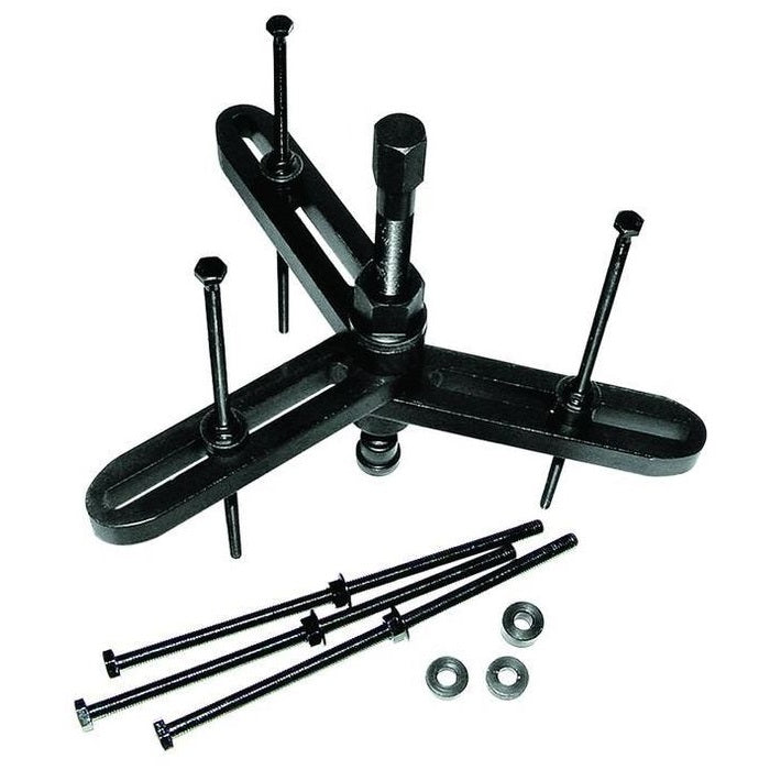 Kit Includes: 3x 8mm bolts, 3 x 6mm stud bolts that have an internal thread from the 3x 8mm bolts can screw into, main canter bolt, and a three leg puller frame.