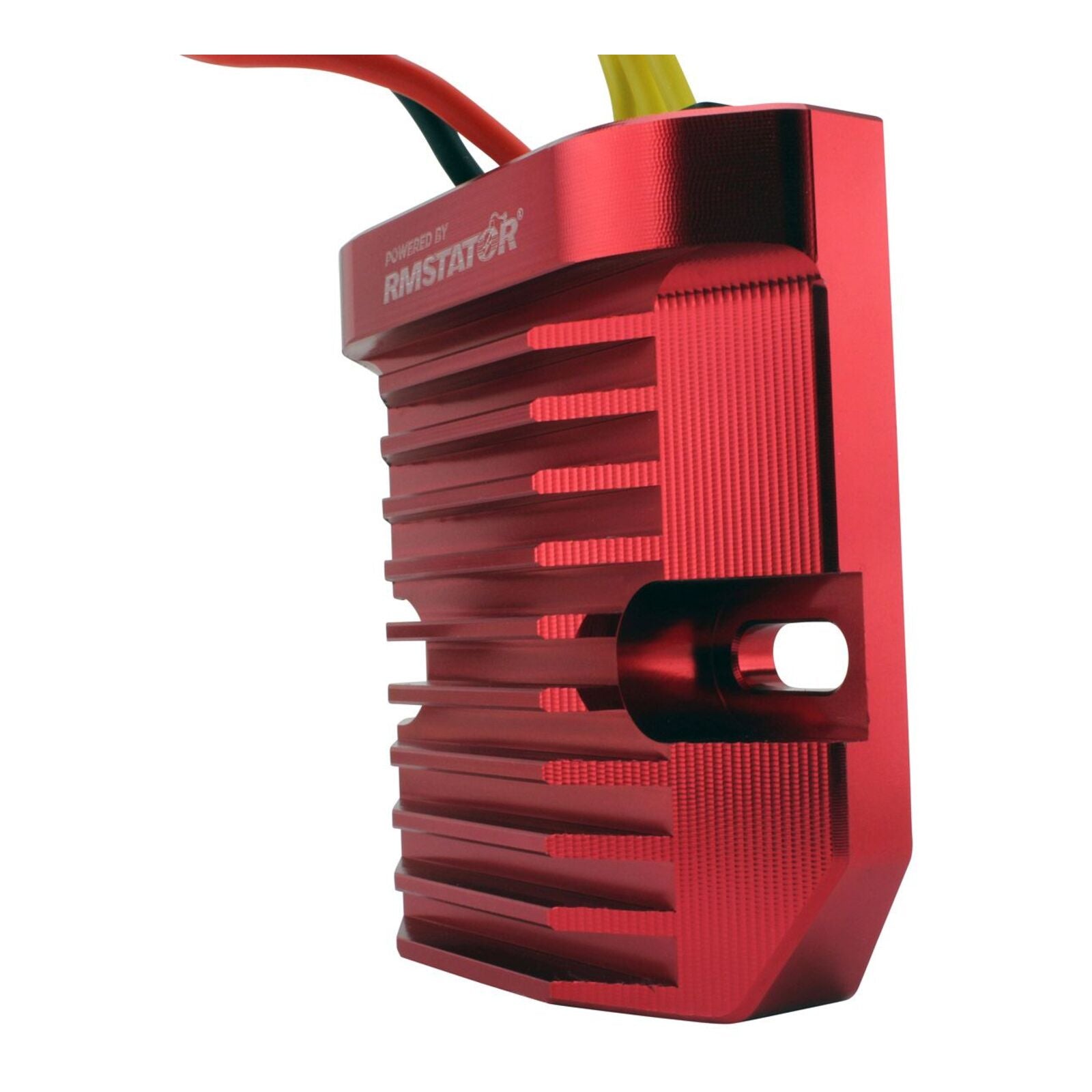 Our new bypass voltage regulator brings back the renowned RMSTATOR Mosfet technology with the RMSTATOR machined aluminum case in a new configuration designed to bypass the main wiring harness and connect the voltage regulator directly to the battery. This configuration has demonstrated a major increase in voltage regulator reliability in real life scenarios over the years.