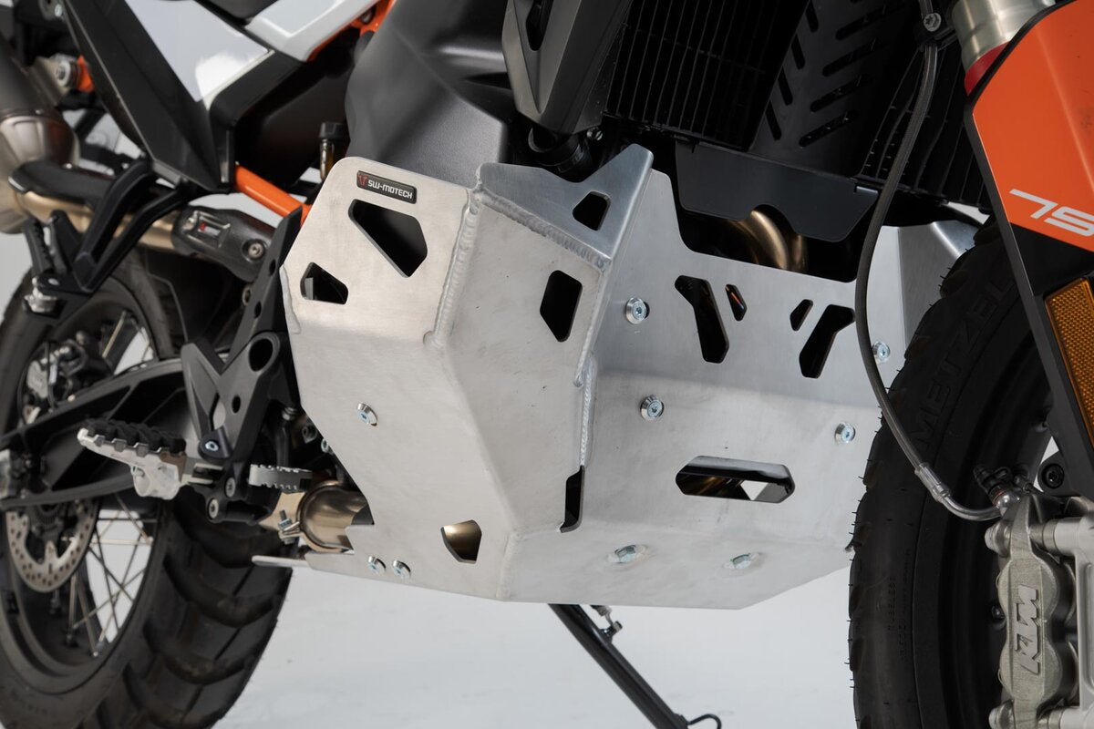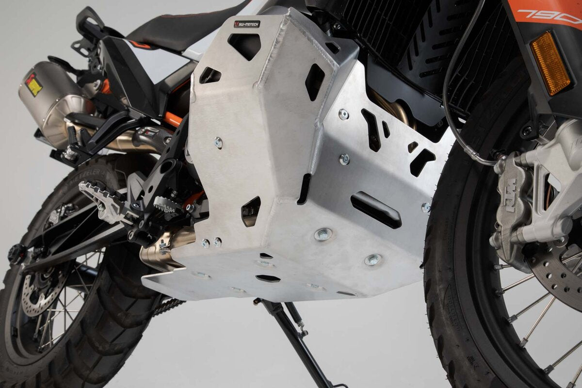 This robust engine guard provides additional protection for the engine and plastic tank of the KTM 790 Adventure / R. The 4 mm thick aluminium sheet of high-quality aluminium alloy protects the engine from stone chipping and ground contact, thus offering you more safety and a customized look.