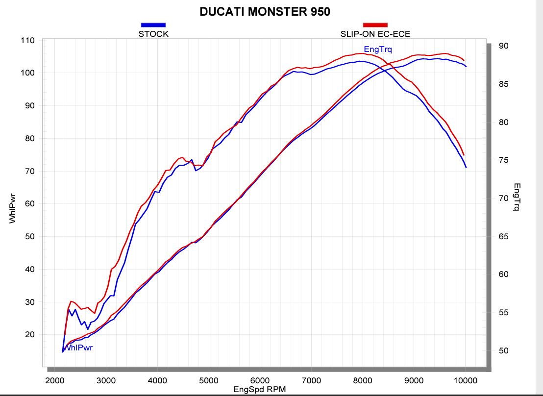 This product features two short mufflers, designed to emphasize the bike’s twin-engine configuration. The outer sleeves and collector are constructed from lightweight titanium, which are sandblasted for an optimal finish and visual appeal. The remaining parts are fabricated from high-grade stainless steel. This Euro 5 EC/ECE type-approved exhaust is a simple plug-and-play installation with no remapping involved. Serving up a deep and dynamic sound to highlight the bike’s engine, the power is increased by 1.6 kW (2.2 hp) at 8,800 rpm, with torque rising by 3.5 Nm at 3,100 rpm (when tested on the Akrapovič dyno in comparison to a Monster using a standard stock exhaust).