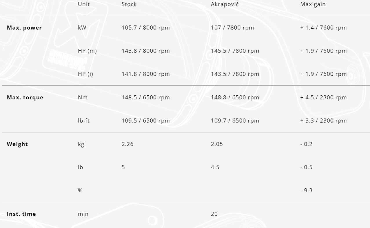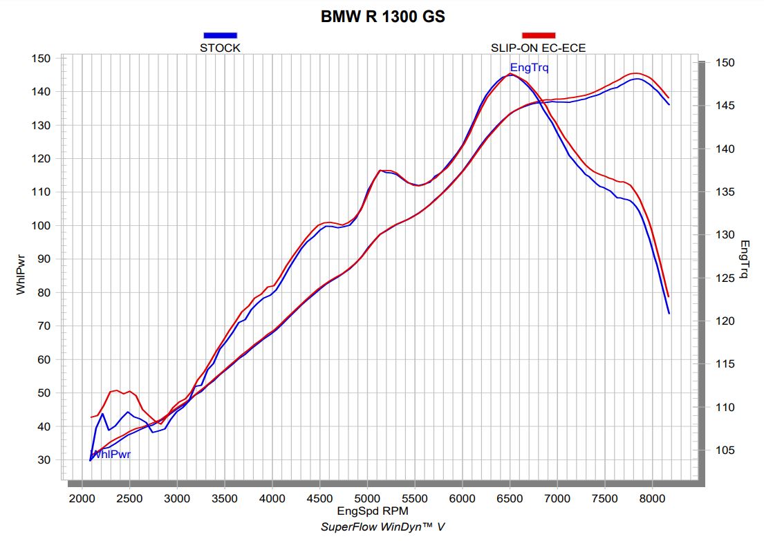 Power and torque increase of 1.4kW (1.9hp) at 7,600rpm and 4.5Nm at 2,300rpm. These figures were obtained in back-to-back runs on the Akrapovič dyno against a BMW R 1300 GS using a standard stock exhaust. EC/ECE-type approval, simple plug and play installation with no remapping required.
