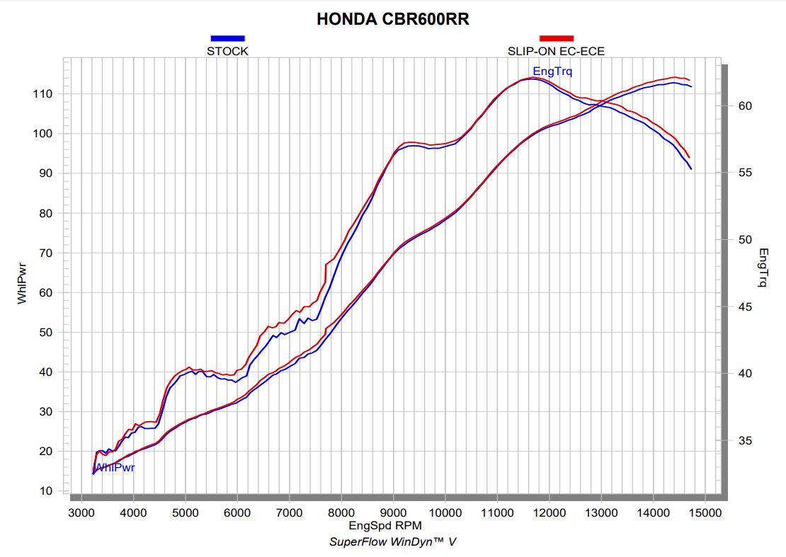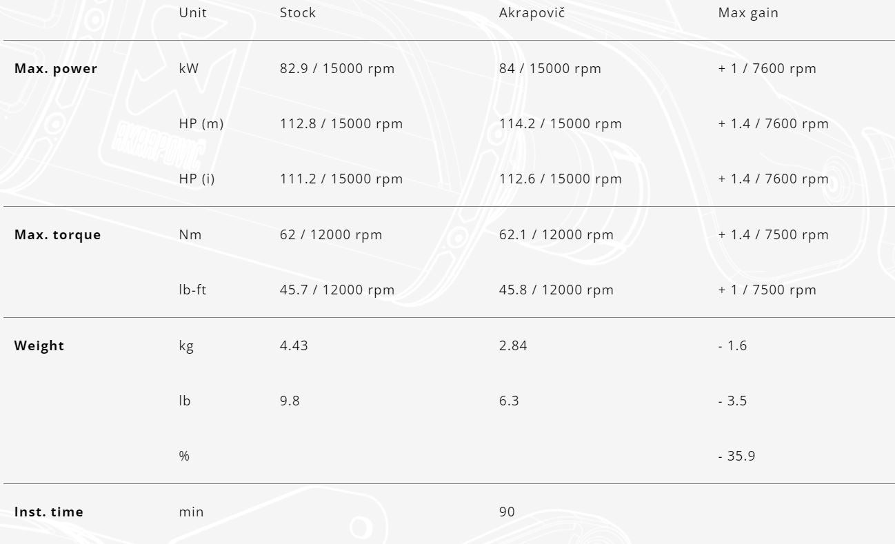 This product is created and designed using race-proven materials, with a high-grade lightweight titanium muffler, stainless-steel link pipe, and carbon-fibre end cap. It provides performance gains predominately in the mid and high rev ranges, with a power increase of 1.0 kW (1.4 hp) at 7,600 rpm and a torque increase of 1.0 Nm at 7,500 rpm, when compared to a Honda CBR600RR equipped with a standard stock exhaust system and tested on the Akrapovič dyno. Lightweight materials provide a weight reduction of 35.9% (1.6 kg) against the standard stock exhaust. The development stages intensely focused on throttle response and rideability, and the sound pattern serves up a deep and sporty tone. The EC/ECE type-approval certificate (Euro5+) with no remapping required means it is a simple plug-and-play installation. The exhaust is compatible with Honda original soft panniers.