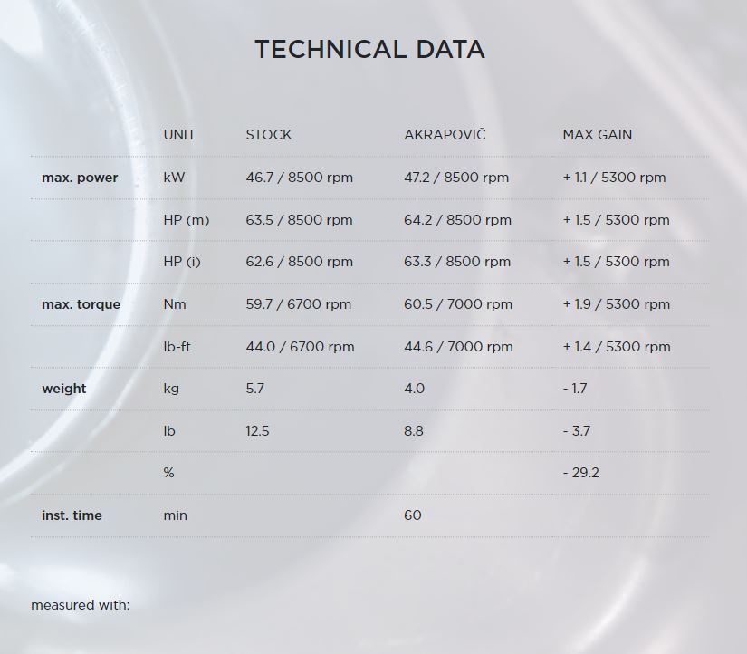 Constructed using a high-grade sandblasted and lightweight titanium muffler outer sleeve with a black-coated stainless-steel end cap, combined with a stainless-steel link pipe and pre-muffler, this system is finished with a stylish Akrapovič monochrome sticker on the muffler. Replacing the exhaust system has a strong impact on the overall appearance of the motorcycle, as well as on its weight and performance. It weighs in at 1.7 kg lighter (a weight saving of 29.2%) compared to the standard stock system, producing an increase in power of 1.1 kW (1.5 hp) at 5,300 rpm and a torque rise of +1.9 Nm at 5,300 rpm when tested on the Akrapovič in-house dyno against a Z650RS with a standard stock exhaust. Providing an impeccable throttle response allied to a deep Akrapovič sound, this plug-and-play installation system requires no remapping to the ECU and meets Euro 5 standards.