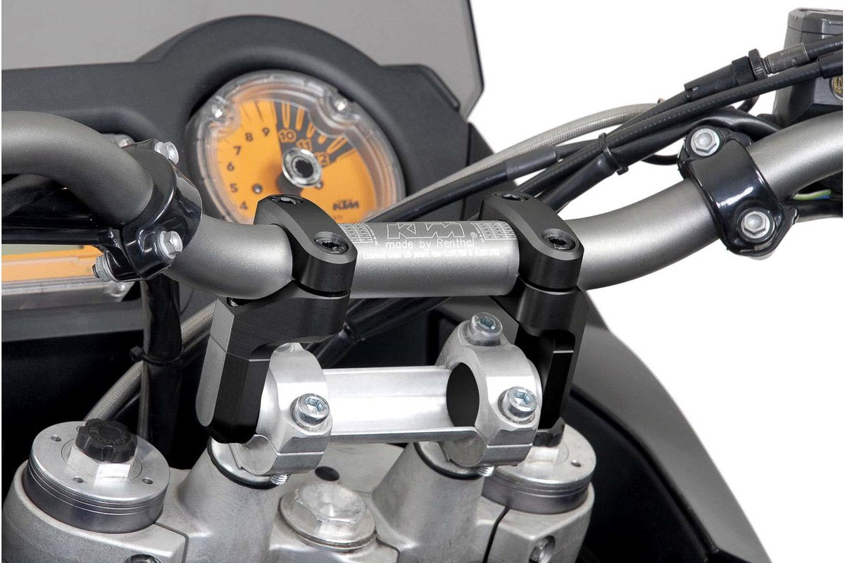 The black, anodized Vario handlebar clamps, made from rugged, CNC-milled aluminum and compatible with 28 mm-handlebars, allow you you to move the original handlebar position by 50 mm or even 60 mm with a spacer.