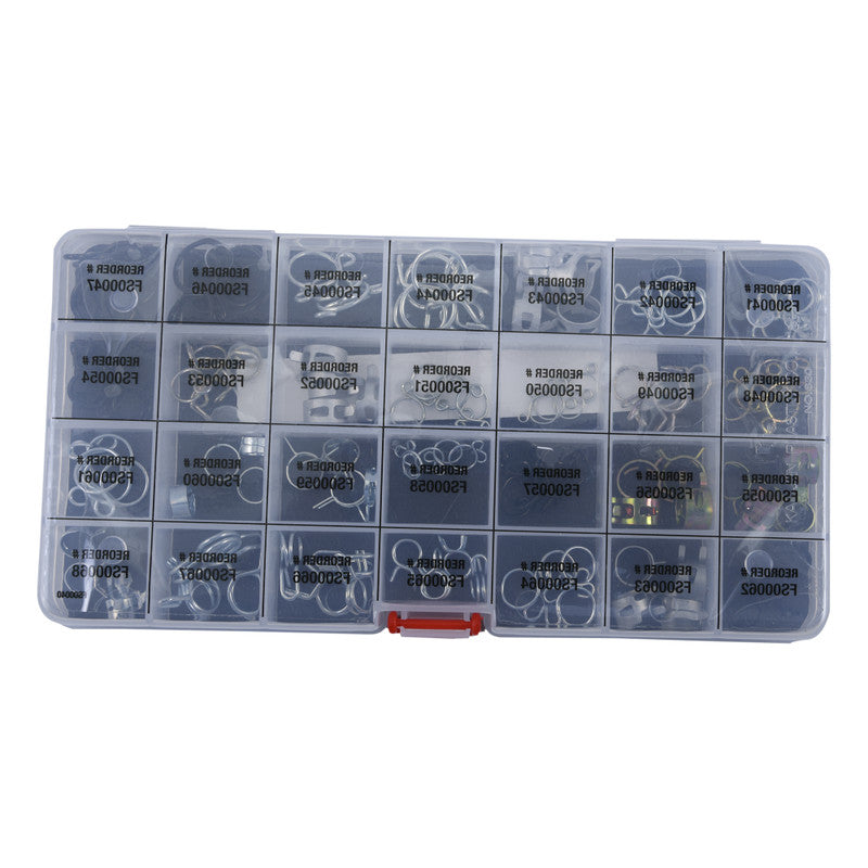 manufactured to meet or exceed OEM performance, aesthetics, and fit. The kit includes 28 different sizes ranging from 7-17mm inside diameter with 4 pack refills available separately for each clamp size. This kit is presented in an easy to access container with separate labelled slots for each clamp making part identification quick and simple, perfect for your personal or professional motorcycle workshop.