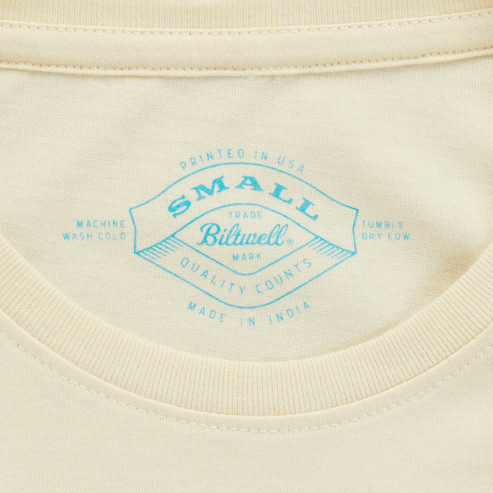 This 5.7oz. 52% Polyester/48% ringspun cotton vintage washed tee is detailed with hand-screened water-based inks, woven clip tags and the irritating collar tag has been replaced by a screen-printed label.