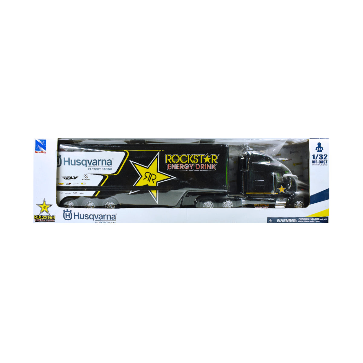1:32 scale New Ray die-cast Husqvarna Rockstar Energy Team truck — detailed miniature race hauler replica.